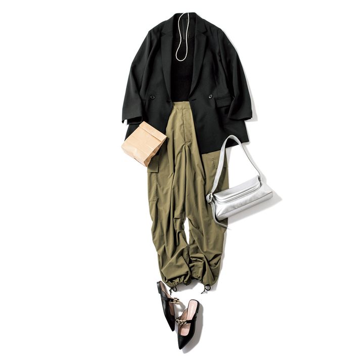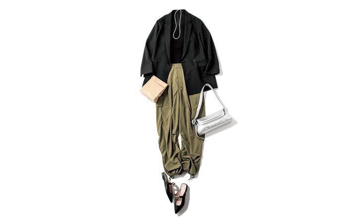 バックウエストのみゴムで、カジュアルながらすっきり見えが叶う。ドロストがアクセント。パラシュートパンツ¥21,890(ネイヴ)