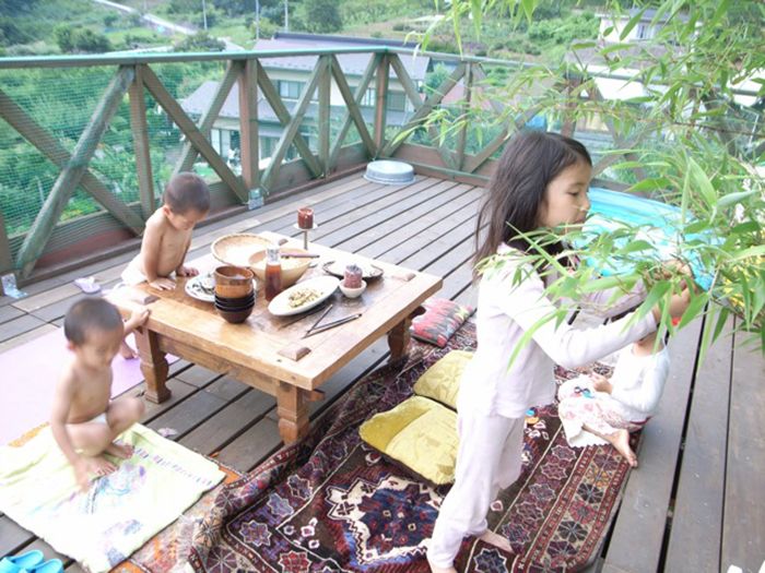 小さい頃田舎で暮らしてた子どもたち。テラスで夕飯食べてた風景。懐かしい。