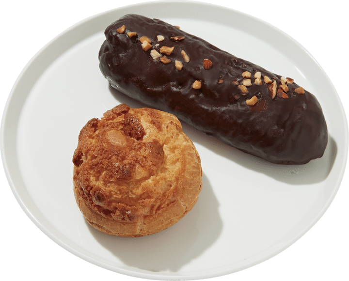 アーモンドが香るクッキー生地をトッピングした、風味豊かなシュークリーム。ビターなチョコレートに北海道産の生クリーム、フランス産の発酵バターを使用したエクレア。ひと口目から溢れ出す濃厚クリームがたまらない♡