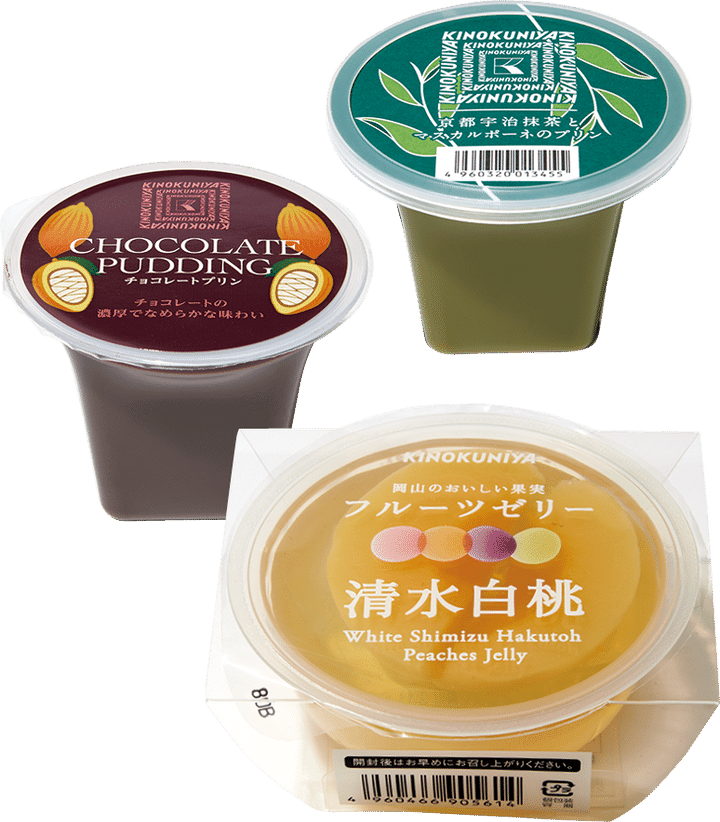 上から:宇治抹茶とマスカルポーネのプリン ¥349、チョコレートプリン ¥324、清水白桃果肉入りゼリー ¥594