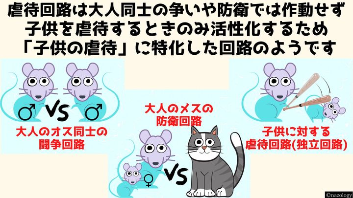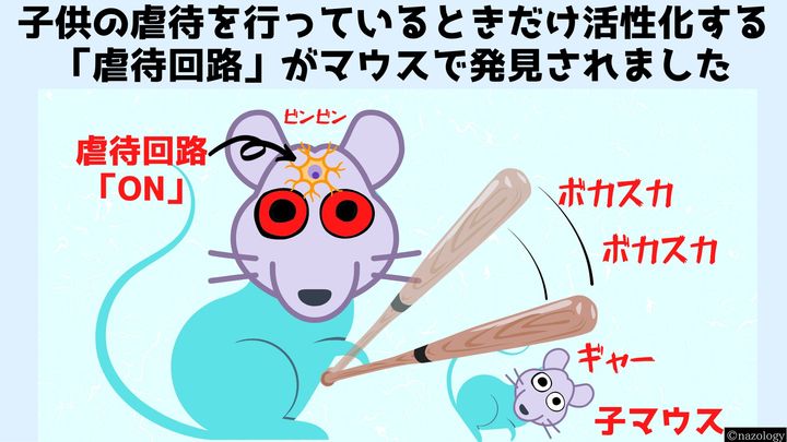 2021年に発表されたハーバード大学の研究によれば、マウスの脳には乳児虐待を受け持つ専門的な神経回路(虐待回路)が存在するとのこと。