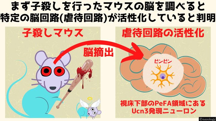 研究者たちはまず、子殺しを実行したマウスの脳の摘出して分析し、通常のマウスとの違いを探索しました(※マウスは通常の生活環境でも一定確率で子殺しを行う)。