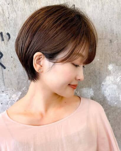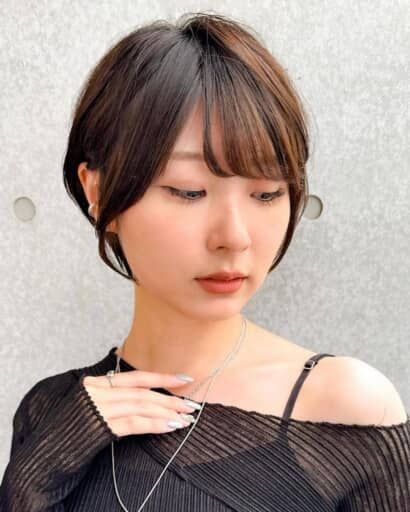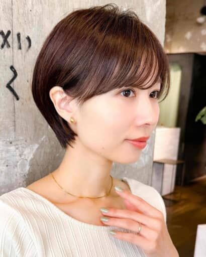 丸みシルエットのショートヘアだと「子供っぽく見えてしまう」と感じているなら、“長め前髪”を合わせて大人感のキープを狙いましょう。