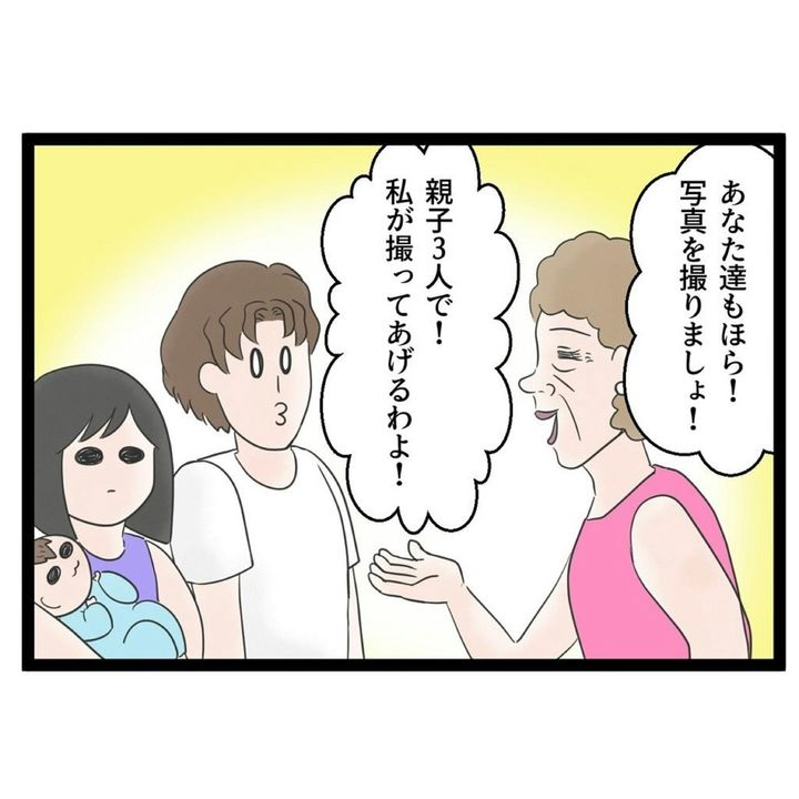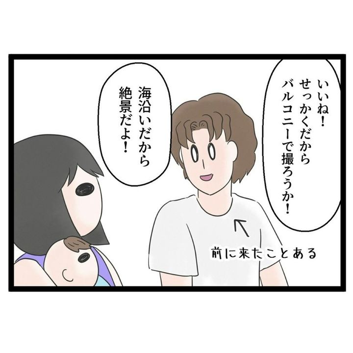 一家で義母の友人宅を訪れたサマ子さん。海沿いの高級住宅街のため、バルコニーからの景色が絶景です。友人の勧めで、家族3人で記念写真を撮ったのですが…。