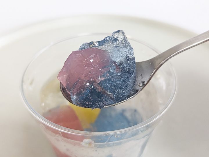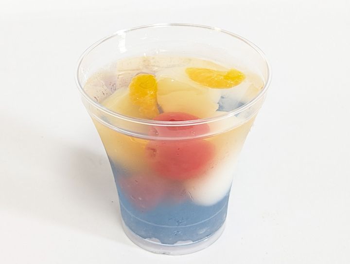 見た目がカラフルかつ涼やかなスイーツは、暑い日にコンビニで見かけるとつい手に取ってしまいます。スイーツ下のブルーの部分はレモンジュレで、透明なレモンゼリーをベースに、みかん、パイン、さくらんぼ、りんご寒天、ヨーグルトわらびが入っています。