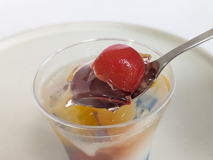 スプーンを入れると、ゼリーと果物や寒天等が一緒にすくえるので、甘酸っぱいみかんやトロピカルなパイナップルなど、ひと口ごとに味わいが変化します。