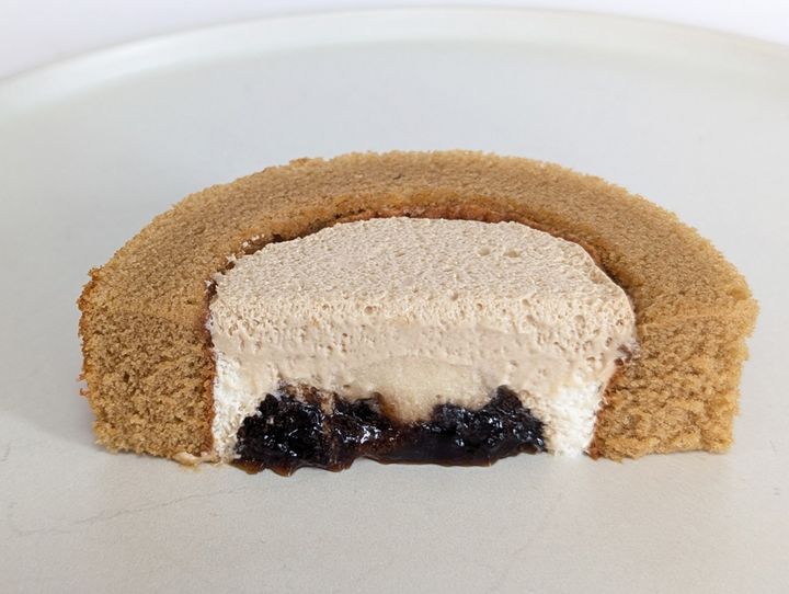 半分に切ってみると、クリームの下にゼリーがたっぷり入っていました! スポンジはフワフワでほんのりコーヒー風味。クリームはカフェラテのような色合いですが、しっかりとコーヒーの苦味も感じられて、ミルククリームの甘さを引き立てていました。