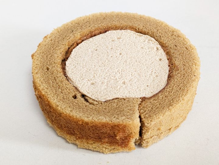コーヒー色のスポンジとクリームのロールケーキです。が、コーヒーゼリー入りとあるのに、見当たりません。