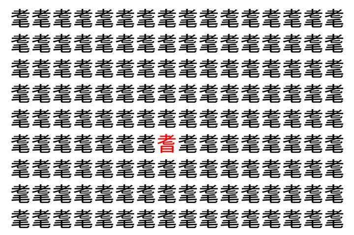 画像の中には、「耄」という漢字が縦に9行、横に16個並んでいます。 全部で144個となりますが・・・、そのうち1つは「異なる漢字」となってますよ!!