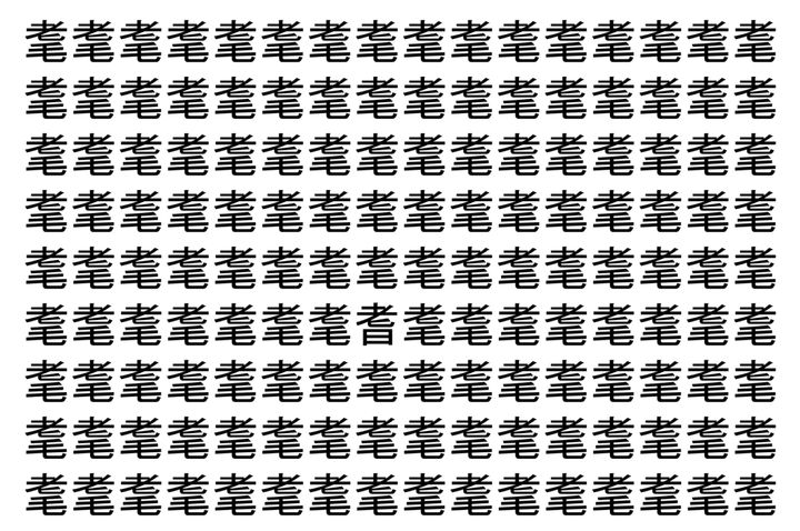 画像に並んだたくさんの「耄」という漢字。 その数144個なのですが・・・、実はその中に1つ違う漢字が紛れ込んでいます!!