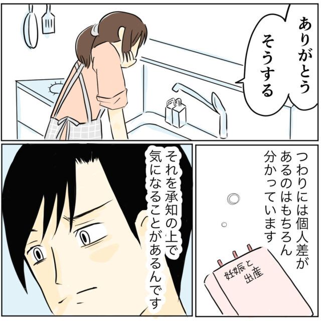 タクマさんの言葉に対して「ありがとう。そうする」と答えるカナコさんを見て、「つわりには個人差があるのはもちろん分かっている」と言うタクマさん、でもそれを承知で気になることがありました。
