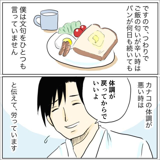 さらに、カナコさんがつわりでご飯の匂いが辛い時は、パンが何日続いても何も文句を言わず、カナコさんの体調が悪い時は「体調が戻ってからでいいよ」と伝えて労っていました。