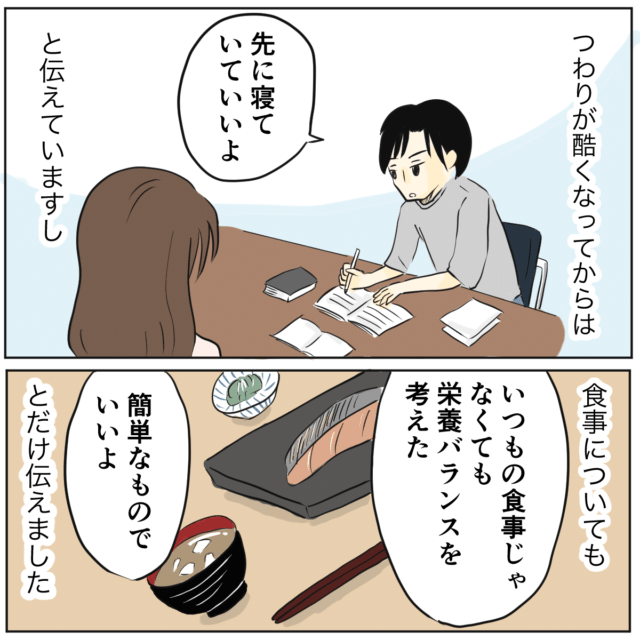 カナコさんが妊娠して生活が変わり始めたタクマさん、カナコさんのつわりが酷くなってからは「先に寝ていていいよ」と伝えたり、食事についても「いつもの食事じゃなくても栄養バランスを考えた簡単なものでいいよ」と伝えていました。