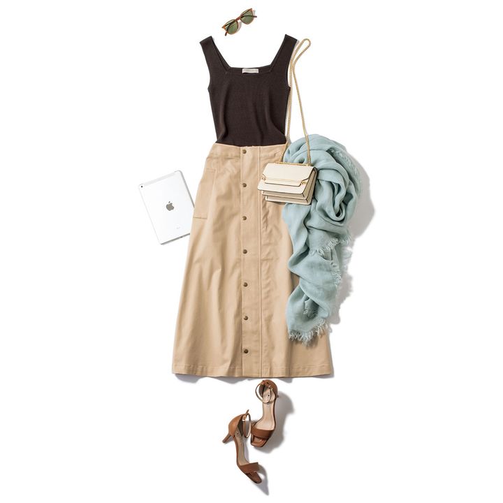 肩が露出しすぎないのでオンオフ使える。ドライな着心地なので、袖ありでも真夏も涼しげ。ブラウス¥18,700(Stola.)