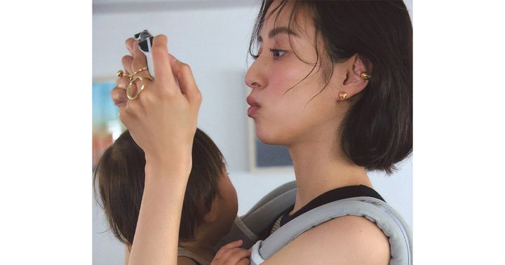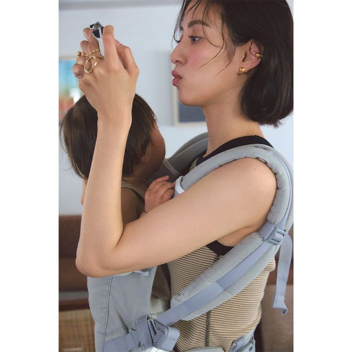 タンクトップ¥11,000(トゥディフル/ライフズ 代官山店)ピアス¥10,450リング[右手人差し指]¥33,000リング[右手中指・薬指]¥49,500(すべてガガン)イヤカフ¥29,700(コールムーン/ショールーム セッション)リング[左手中指]¥38,500(ブランイリス/ブランイリス トーキョー)抱っこ紐/スタイリスト私物