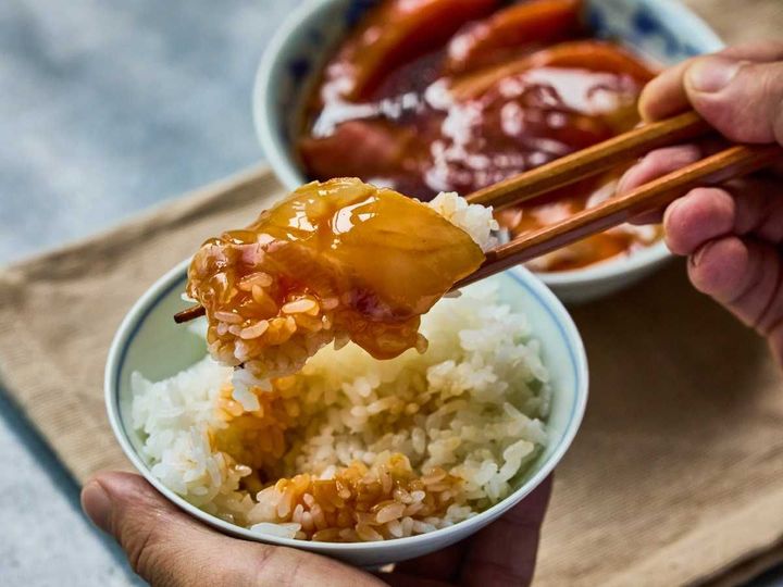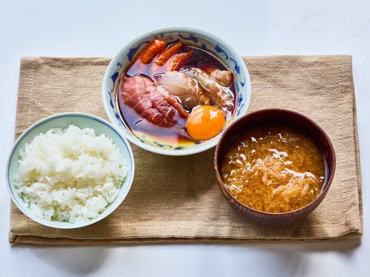 器にたれの材料を入れて混ぜ、刺し身を加えて卵を割り入れる。卵を溶き、刺し身にからめながらご飯とともにいただく。