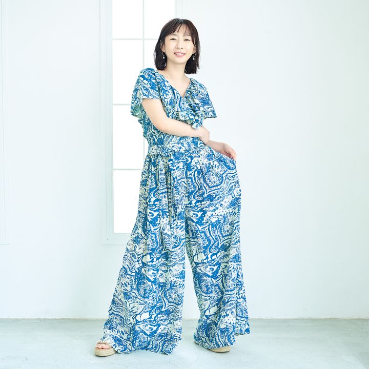 サロペット¥42,900(ヴェルニカ/ヴェルニカ ルーム)靴¥30,800(ツルバイ マリコ オイカワ)ピアス¥5,940左手パールリング¥4,590(ともにアビステ)