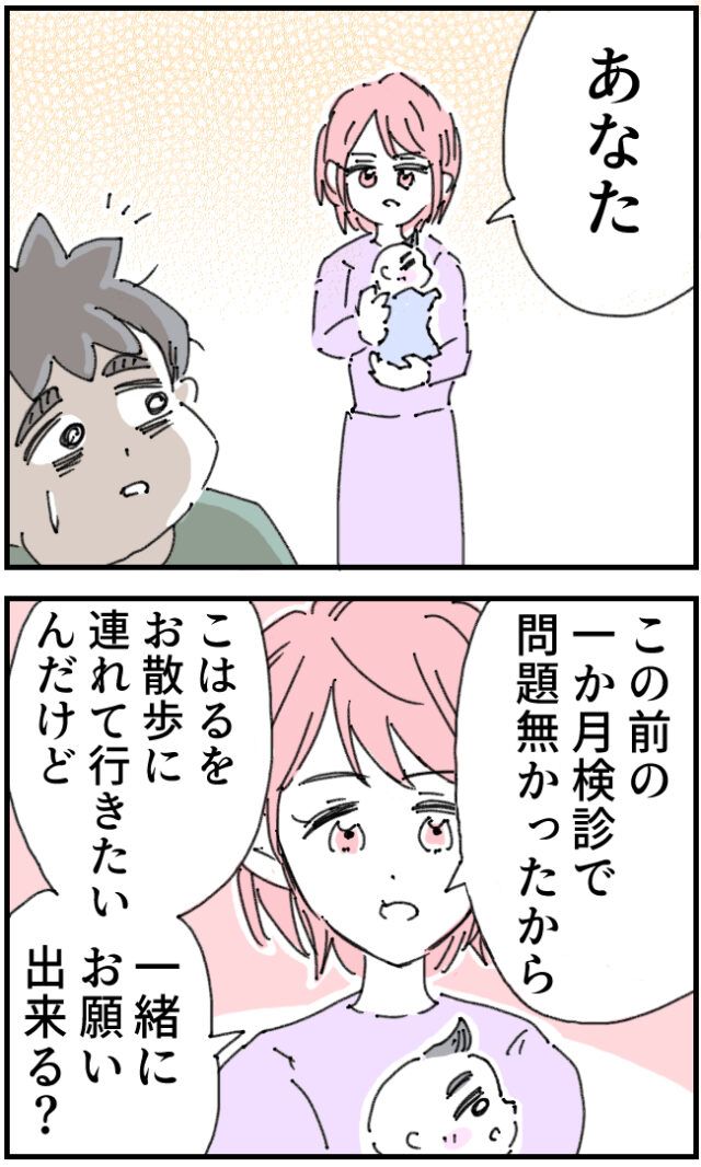 前日から、こはるちゃんのお世話で眠れない夜を過ごしたいちろうさんに「あなた、この前の一か月健診で問題なかったから、こはるをお散歩に連れて行きたいんだけど、一緒にお願いできる?」とかおりさんが言いました。