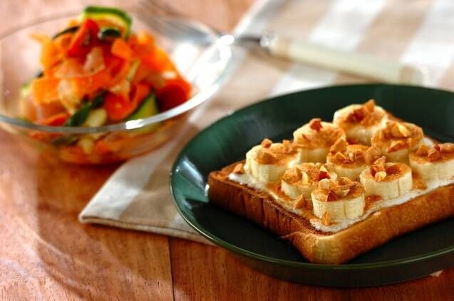 腸内環境を整える甘酒とヨーグルトを合わせたクリームをトーストに。その上にバナナとアーモンドを乗せた整腸作用と美肌効果も期待できる万能トースト。副菜のズッキーニとニンジンのサラダはピーラーを使ってヒラヒラに仕上げて。ドレッシングが絡みやすくなります。