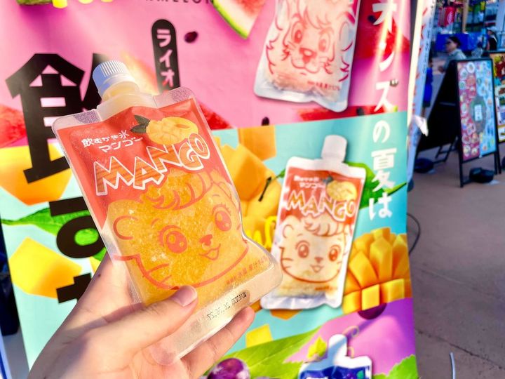 味は結構甘さが強め、フレッシュなマンゴーというよりはドライマンゴーのような味わい? に感じられました(シロップ的なケミカル感はあまりないのはおいしい)。テクスチャはシャーベットやシェイク的なものかな、と思いきや、しっかりした氷の食感は確かにかき氷で、袋を持って中身を押し出して食べるスタイルでした。