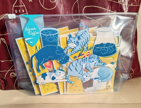 「オリジナルジッパーバッグ&ミニジッパーバッグ」と「カフェカルディドリップ ニャンコーヒー」5袋入り。