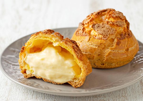 アーモンド香る甘いクッキー生地をトッピング。海道小麦と発酵バターを使い、シュー生地だけでもおいしく、生クリーム入りの濃厚カスタードクリームが楽しめるシュークリームです。
