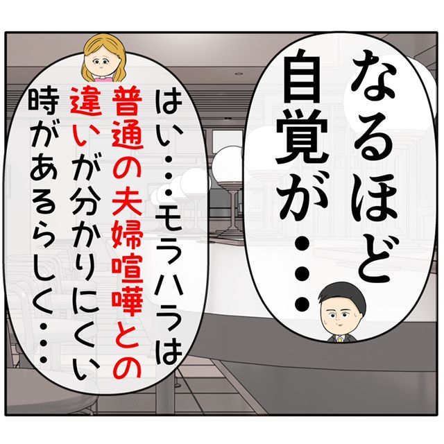 「なるほど自覚が・・・」ふり子さんの話しを聞いて思わず納得する良し男さんに、ふり子さんはさらに、モラハラは普通の夫婦喧嘩との違いが分かりにくいと説明します。
