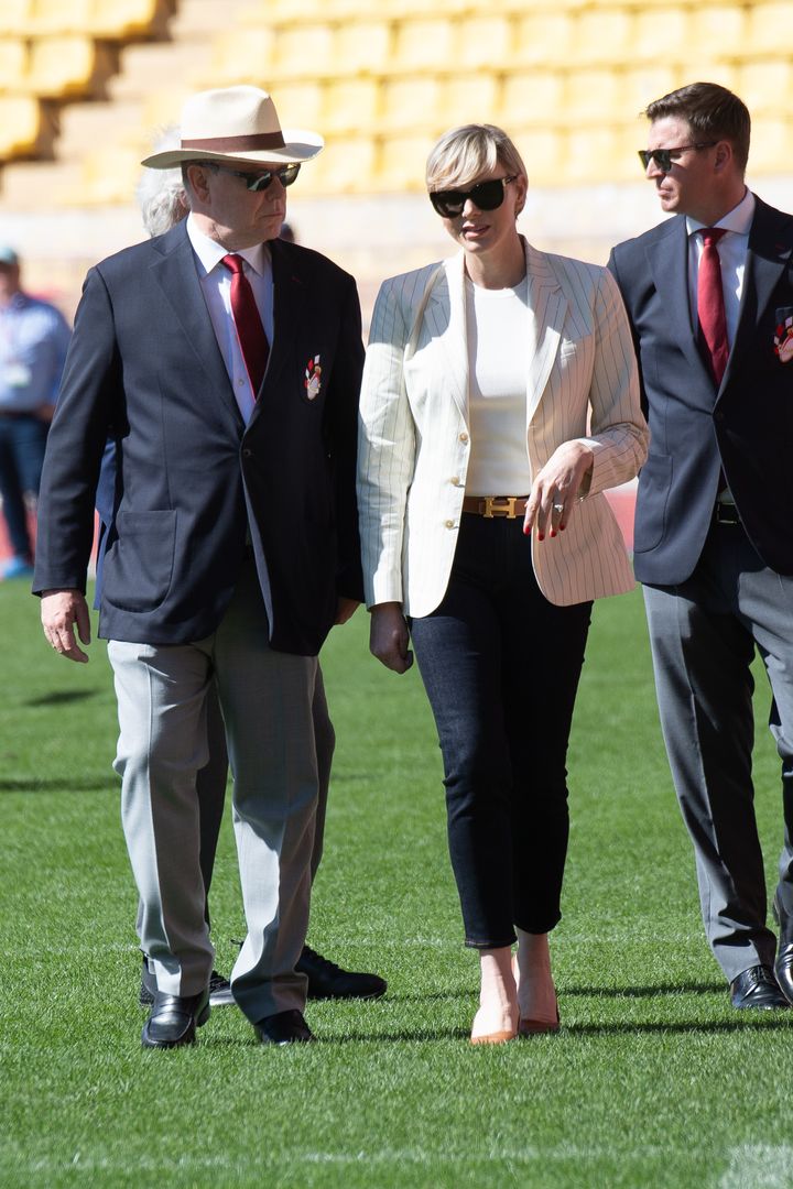 モナコのラグビー連盟とシャルレーヌ公妃財団が主催するトーナメントを訪れた際には、ポロ ラルフ ローレン(POLO RALPH LAUREN)のコットンストライプジャケットにスキニーデニムをコーディネート。エルメス(HERMES)のベルトとマノロ ブラニク(MANOLO BLAHNIK)のポインテッドトゥパンプス「Homeraso」といった上質なレザーを使用した小物類を合わせることで、カジュアルな雰囲気の中にもフォーマル感をキープした。