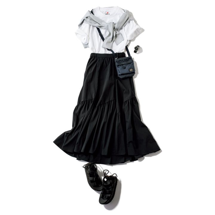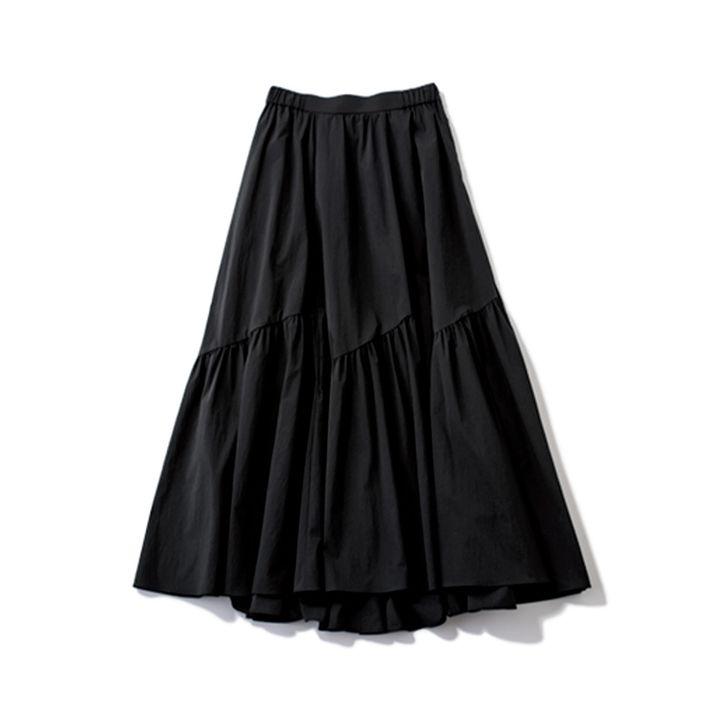 バイアス状のイレギュラーな切り替えと、たっぷりとしたギャザーが目を引くデザイン。スカート¥26,400(アルアバイル)