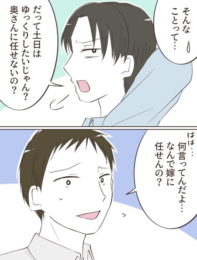 「そんなことって・・・」とキョウスケさんのことばに反応した高橋さんに「だって土日はゆっくりしたいじゃん?奥さんに任せないの?」と聞いてみると、少し引きぎみ高橋さんは「何言ってんの?なんで嫁に任せんの?」と逆に聞いてしまうほど信じられない、という表情でキョウスケさんを見ました。