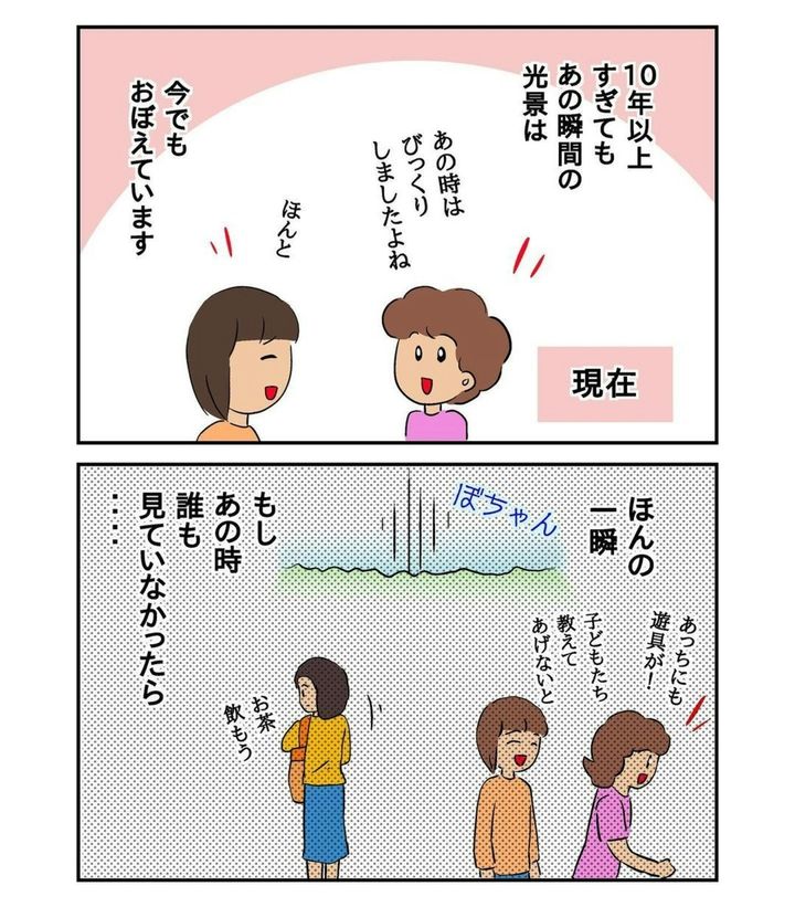10年以上も前、作者・あやかず(@ayakazuarireosan)さんは家族で訪れた大きな公園で衝撃的な光景を目撃することに。前日は雨が降っていたものの、公園のそばにある川では水遊びをする家族もたくさんおり、それをほほえましく眺めていたあやかずさんと義母。しかし、目の前で女の子が川に落ちるところを目撃し、これは大変なことが起きたとぼう然とすることに…。水難事故の恐ろしさを描いた『水の中に消えたあの子』前編をごらんください。