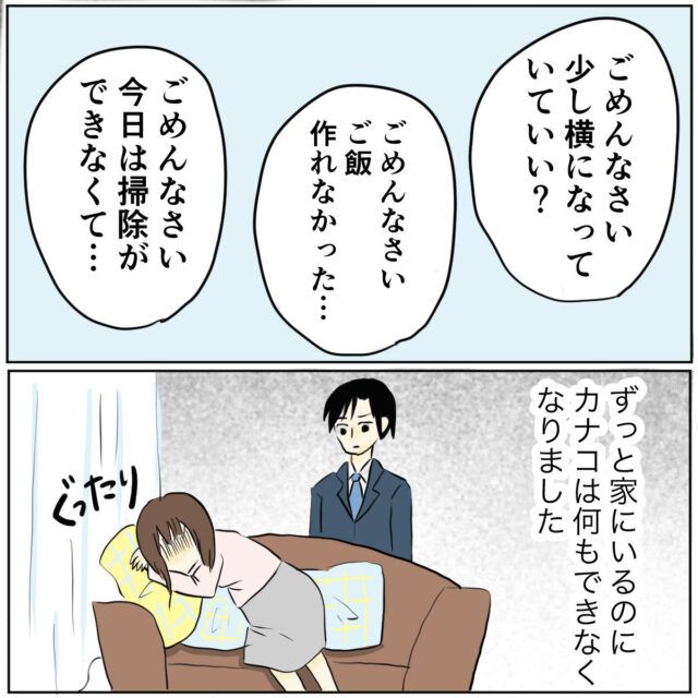 ある日は「ごめんなさい。少し横になっていていい?」またある日は「ごめんなさい。ご飯作れなかった」別の日には「ごめんなさい。今日は掃除ができなくて・・」とできないことばかり。タクマさんが仕事から帰って、ぐったりとソファーに横たわるカナコさんを見ながら「ずっと家にいるのにカナコは何もできない」そう思うようになりました。