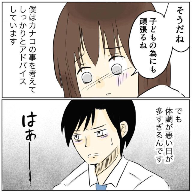 「やっぱりしっかり作って食べた方がいい」とタクマさんに言われたカナコさんは「そうだね。子どもの為にもがんばるね」と真っ青な顔で答えました。カナコさんの事を考えてしっかりとアドバイスをしていると考えていたタクマさんは、体調が悪い日が多すぎる、とため息をつきながら思いました。