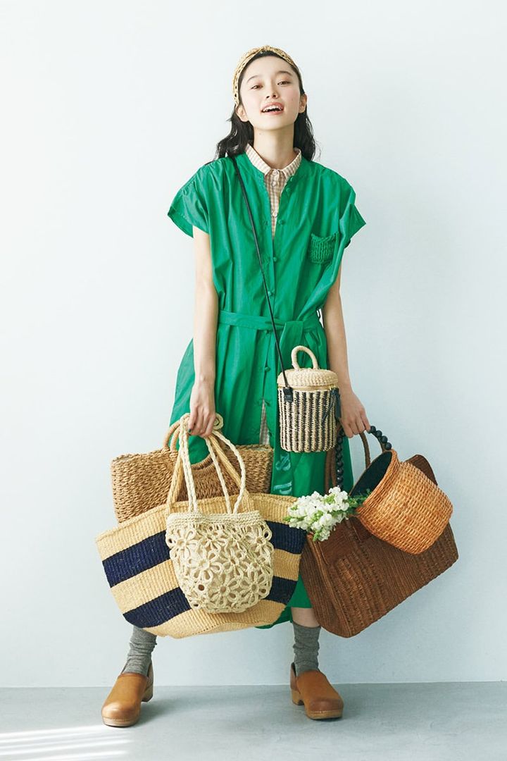 ラフィアヘアバンド¥11,000/セイラ ミヤムラ(ススプレス)、斜め掛けした筒型ショルダーバッグ¥18,700/バグマティ、(左手 奥)こげ茶 ラフィアバッグ¥42,900/メゾンエヌアッシュパリ(ともにサロン アダム エ ロペ)、(左手 手前)ビーズハンドルかごバッグ¥15,400/コット(セムインターナショナル)、(右手 奥)ハーフムーン型バッグ¥4,730、(右手 手前)フラワーコロントート¥4,290/ともにワンズテラス(ワンズテラスお客様相談室)、(右手 真ん中)ボーダーサイザル麻バッグ¥10,780/マチャコス(マッハ55リミテッド)、グリーン ワンピース¥86,900、中に着たギンガム×グリーン ワンピース¥84,700/ともにキャビネット(マッハ55リミテッド)、ソックス¥3,850/アンティパスト(クープ・ドゥ・シャンピニオン)、シューズ¥29,700/ダンスコ(シースター)