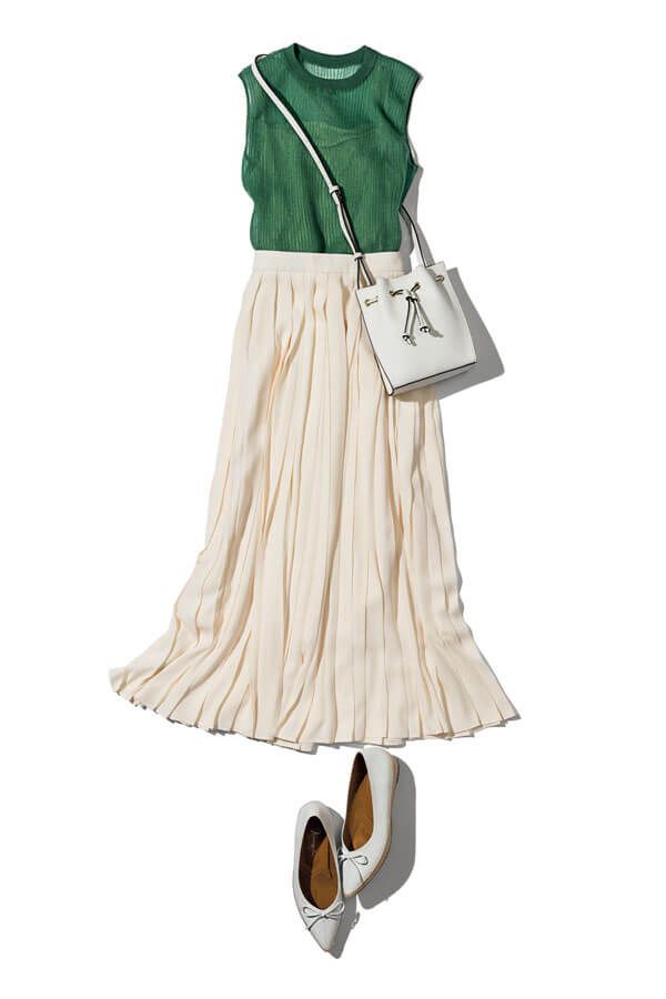シックな趣漂うグリーンニットも、シアー素材なら肌がほんのり透けて軽やか。スカートと小物で白をたっぷり盛れば、夜でもパッと目を引く装いに。