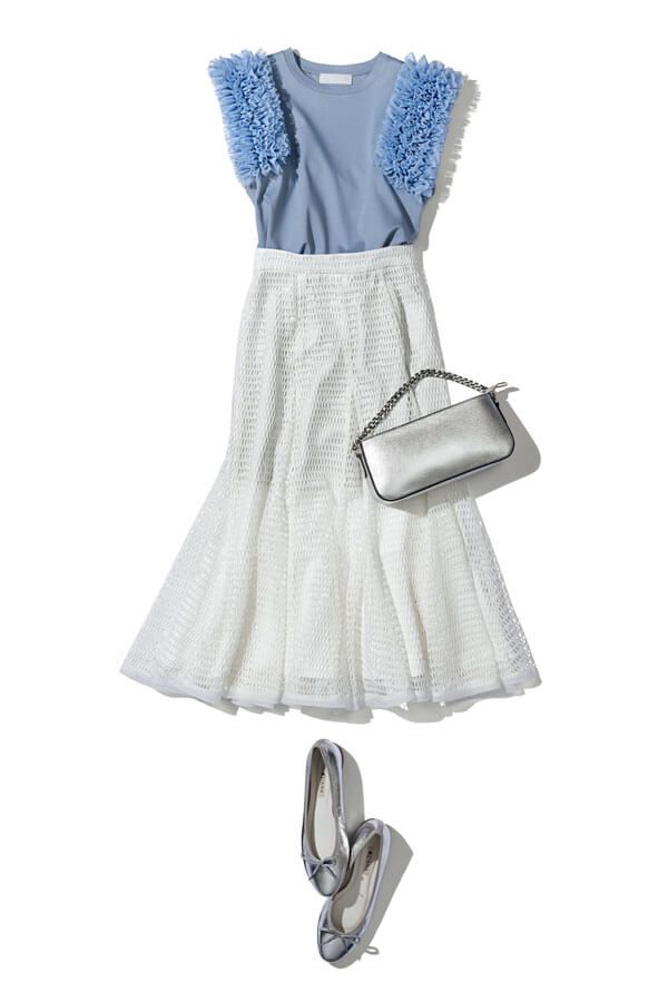 ブルーと白の明度高い配色に、シルバー小物で輝きも添えれば夜に沈むリスクは皆無。肩まわりを彩るチュールのふわふわ感でも、浴衣に負けない華やぎに。