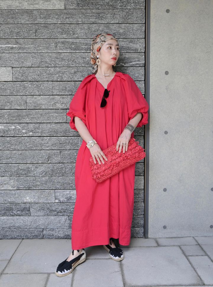 キレイ色のドレスを主役にスカーフを巻いて一層旬顔に。「シンプルなデザインのドレスなので小物使いでコーデを盛り上げました。スカーフは一年中愛用しているアイテムなのですが、今回はコットンシルクの軽い素材感のものをチョイスしています」