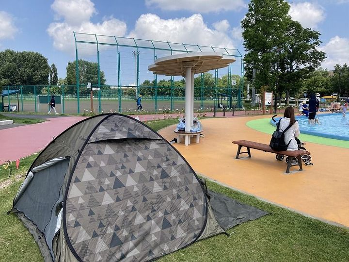 ちゃぷちゃぷ広場はぐるっと芝生に囲まれていて、 小型テント を広げることができます。