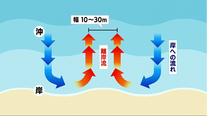 「離岸流に流されてしまうと、沖のほうへどんどん向かってしまう。離岸流は強い流れだと、逆らって泳ぐのは非常に難しい。流された場合は、まっすぐ岸に向かって逆らって泳がないで、まずその離岸流の流れから離れて、そこから初めて陸に向かって泳ぐ」