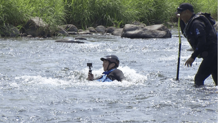 「めちゃくちゃ流れが速い。もう流される。予想と全然違いますね。こんな流れが速いと思わなかった。見た目と違って子どもは絶対危ないと思う」