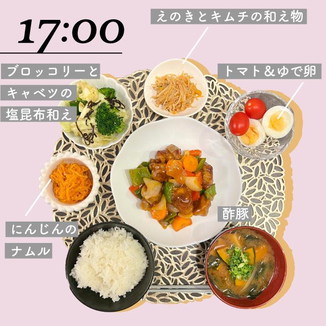 この日は酢豚、にんじんのナムル、ブロッコリーとキャベツの塩昆布和え、お味噌汁など。えのきとキムチの和え物は“腸活”にいいと聞いて作ってみました。