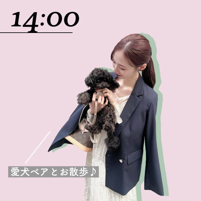 メイクや身支度を整えてから愛犬のお散歩に出発。犬種はチワプーで名前は「ベア」です♡