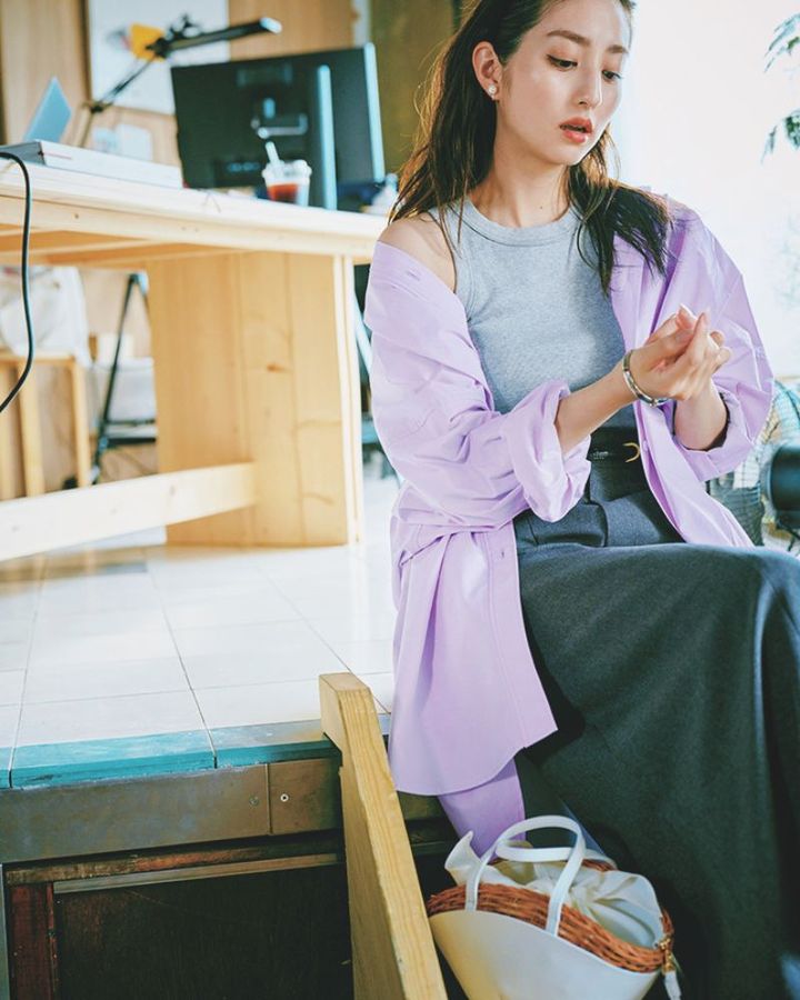 大胆に肩を露出するアメスリタンクトップは、嫌味のない女性らしさを演出できるアイテム。一方で、肩回りががっちり見えて着太りするというお悩みも。スタイルアップも叶えながら旬なコーデに仕上げるなら、身幅がゆったりとしたシャツを羽織りに使って、露出を減らすとうまくいきます。さらにトップスと同系色のペンシルスカートを合わせてセットアップ風にすれば、Iラインが強調されてシュッと引き締まったコーデに。