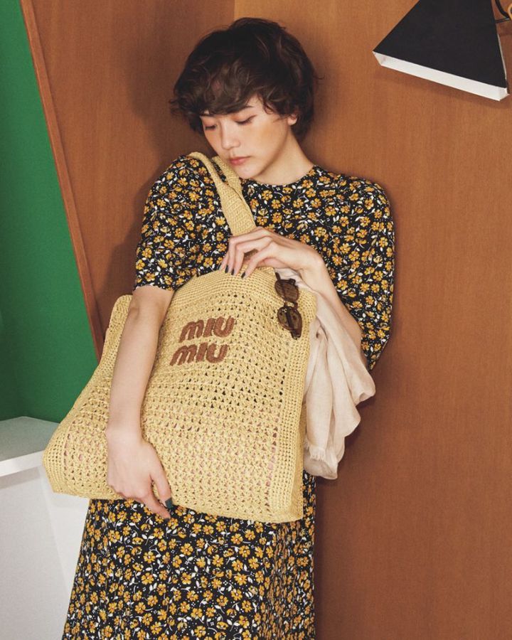 バッグ¥247,500※予定価格(ミュウミュウ/ミュウミュウ クライアントサービス)ワンピース¥46,200(ザシンゾーン/シンゾーン ルミネ有楽町店)サングラス¥42,900(プロポ/プロポデザイン)ストール¥37,400(ファリエロ サルティ/八木通商)