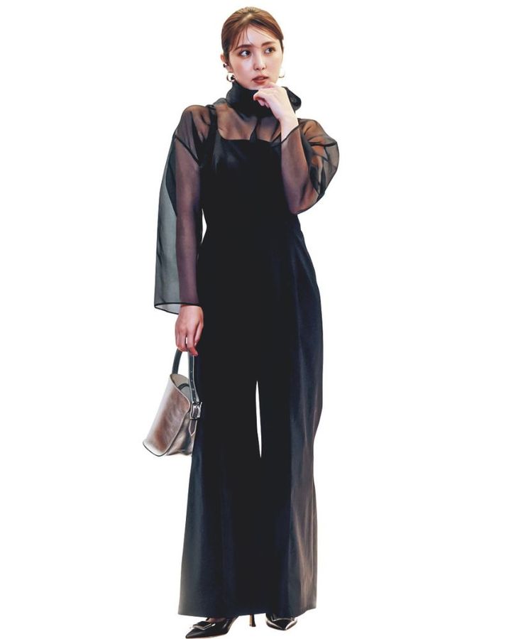 ホテル女子会やオケージョンシーンで活躍するのがシースルー服。ほっこり見えを回避してグッと抜け感を演出できるので、今季のマストハブアイテムです。全身をオールブラックでまとめても、透けた肌見せが奥行きを与え女性らしさが備わります。媚びた印象にならないようパンツスタイルでキリッとハンサムに仕上げて、洗練度を高めて。