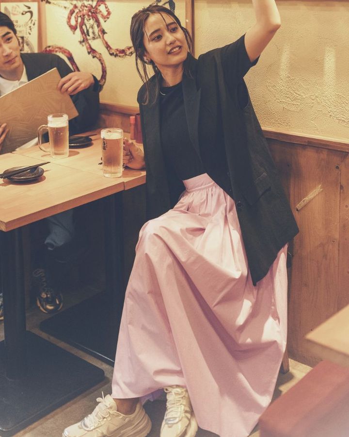 夏休みの昼飲みデートではディナーよりかしこまらず、ランチよりきちんと感をつけた絶妙なバランスが好印象。ドラマティックなフレアスカートは黒に頼らず、ポップなピンクを投入すれば愛嬌たっぷりで気負わない佇まいに昇華します。そのぶんトップスは黒でコントラストをつけてシックに引き締めつつ、Tシャツで親しみやすさを加えて。仕上げにジレを羽織ってグッと知的さをアピールするとうまくいきます。