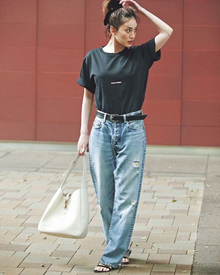 デニムパンツとTシャツを合わせた休日ムード全開なワンツーコーデは、手抜きっぽい印象になりがち…。そんなときはレザー小物やサンダルを加えて、カジュアルさをキープしつつ大人の品格を纏って。さらに白よりシックにキマる黒Tを選んでモードに引き締めつつ、華奢なロゴ入りでグッと洒落感を出すのがよそ行きモードのポイントです。