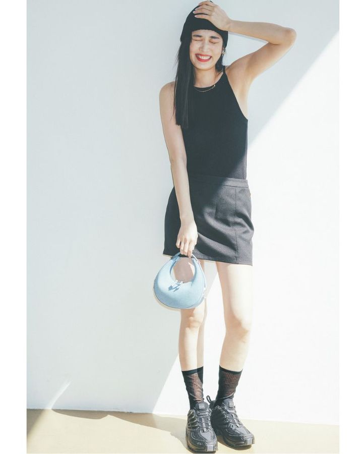 大人が敬遠しがちな夏の肌見せは、オールブラックでまとめたワンピース風の着こなしでクリア。ヘルシーさが加わり、アイテム単体のインパクトも抑えられます。さらに重めのスニーカーとソックス合わせでブーツライクに仕上げれば、露出も抑えつつカジュアルに仕上がります。小物はカラーバッグやニット帽を合わせて大人の遊び心をプラスして。