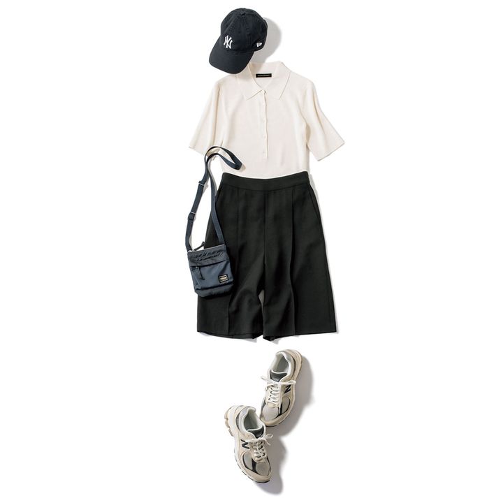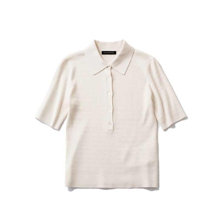 上品な五分袖なのでスポーティすぎない。ほどよく体にフィットするシルエット。ポロニット¥15,000(バナナ・リパブリック)