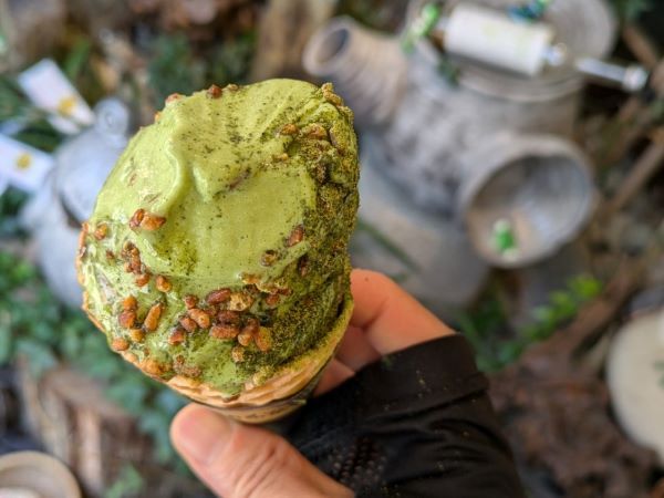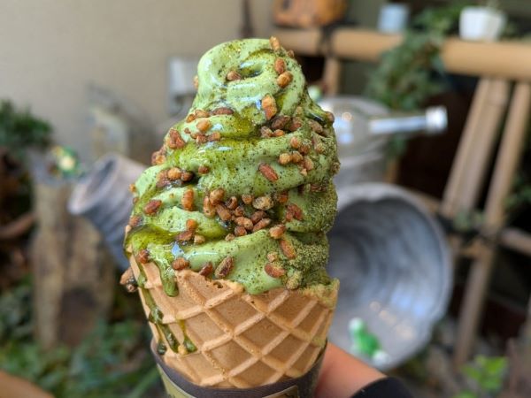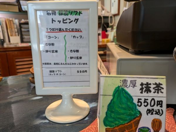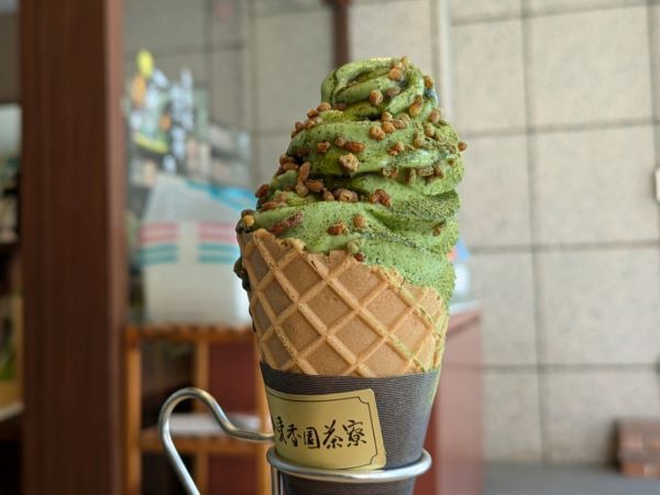 さてさて今回のお目当ては・・・?お茶屋さんのこだわりソフトクリームです!コーンかカップを選び、きな粉か炒り玄米のトッピングを選ぶことができます。今回は、コーンに炒り玄米を選びました。